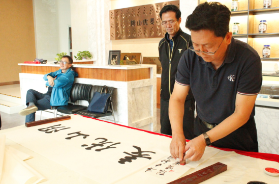 隨后,大家又來到燕麥博物館,感受燕麥文化、體驗(yàn)燕麥產(chǎn)品的同時(shí),并現(xiàn)場(chǎng)目睹書法名家張曉華老師的揮毫潑墨。孟才介紹,中國燕麥的市場(chǎng)份額在100億元以上,裸燕麥起源于中國,但是國內(nèi)燕麥深加工所用的原糧90%是進(jìn)口皮燕麥,只有10%是國產(chǎn)裸燕麥,主要原因是國產(chǎn)裸燕麥多采用傳統(tǒng)旱作耕作方式,人工除草,有機(jī)種植,不使用除草劑、農(nóng)藥、化肥等,畝產(chǎn)較低。但是,也正因如此裸燕麥的口感更好、質(zhì)量更佳且蛋白質(zhì)、脂肪、β-葡聚糖等營(yíng)養(yǎng)成分均高于皮燕麥。得天獨(dú)厚的資源優(yōu)勢(shì)是陰山優(yōu)麥建企立身的根基和市場(chǎng)競(jìng)爭(zhēng)的底氣,產(chǎn)品全部采用優(yōu)質(zhì)的國產(chǎn)裸燕麥就是陰山優(yōu)麥的核心競(jìng)爭(zhēng)力!
