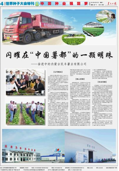 2014年5月27日,農(nóng)民日報世界種子大會特刊以 “中國種業(yè)強(qiáng)國夢” 為主題刊登了《閃耀在“中國薯都”的一顆明珠——奮進(jìn)中的民豐薯業(yè)有限公司》一文。